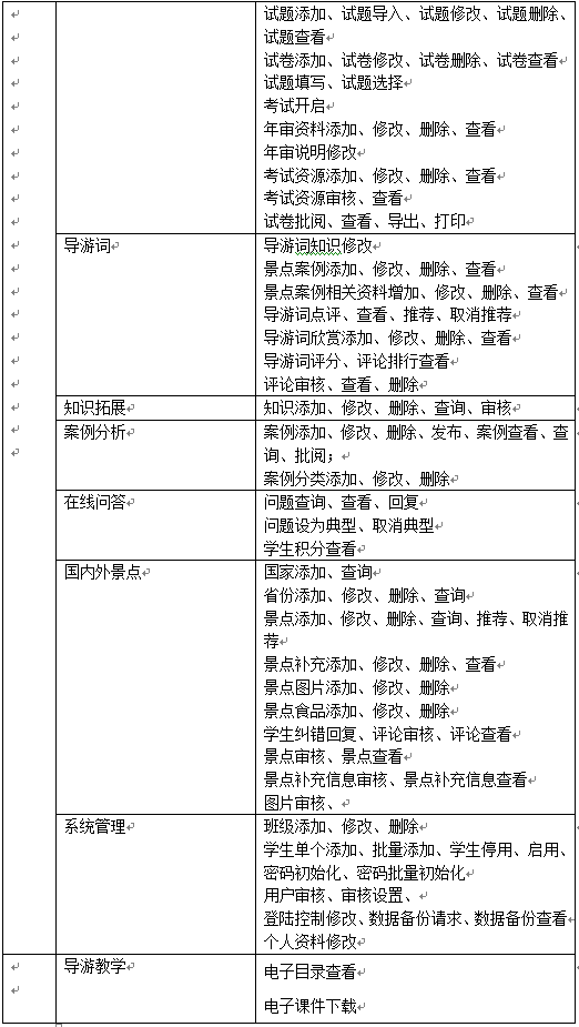 教(jiao)師主要功能包括班級學生管理(li)、導(dao)(dao)游(you)基(ji)礎知(zhi)識(shi)管理(li)、國內(nei)導(dao)(dao)游(you)知(zhi)識(shi)管理(li)、國外(wai)(wai)導(dao)(dao)游(you)知(zhi)識(shi)管理(li)、情景題目管理(li)、導(dao)(dao)游(you)證(zheng)考(kao)試資料管理(li)、模(mo)擬考(kao)試、導(dao)(dao)游(you)詞管理(li)、導(dao)(dao)游(you)案例管理(li)、知(zhi)識(shi)拓展、案例分析管理(li)、在線(xian)問答、國內(nei)外(wai)(wai)景點信息管理(li)等。