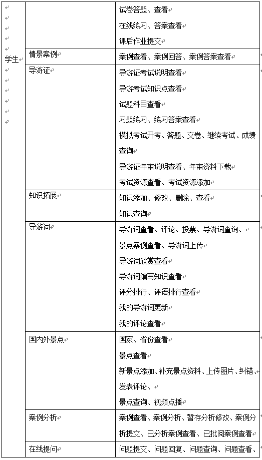 學(xue)生的主要功能是導(dao)游(you)(you)教學(xue)知識(shi)的學(xue)習、完成情景推(tui)理(li)中包含(han)的案例(li)及(ji)題目、導(dao)游(you)(you)證考試學(xue)習及(ji)模擬(ni)考試、導(dao)游(you)(you)拓展(zhan)知識(shi)學(xue)習,同時(shi)可添加新的知識(shi)供(gong)其他(ta)同學(xue)學(xue)習、導(dao)游(you)(you)詞學(xue)習并編寫導(dao)游(you)(you)詞、國內外景點學(xue)習、案例(li)分析和在線提(ti)問。